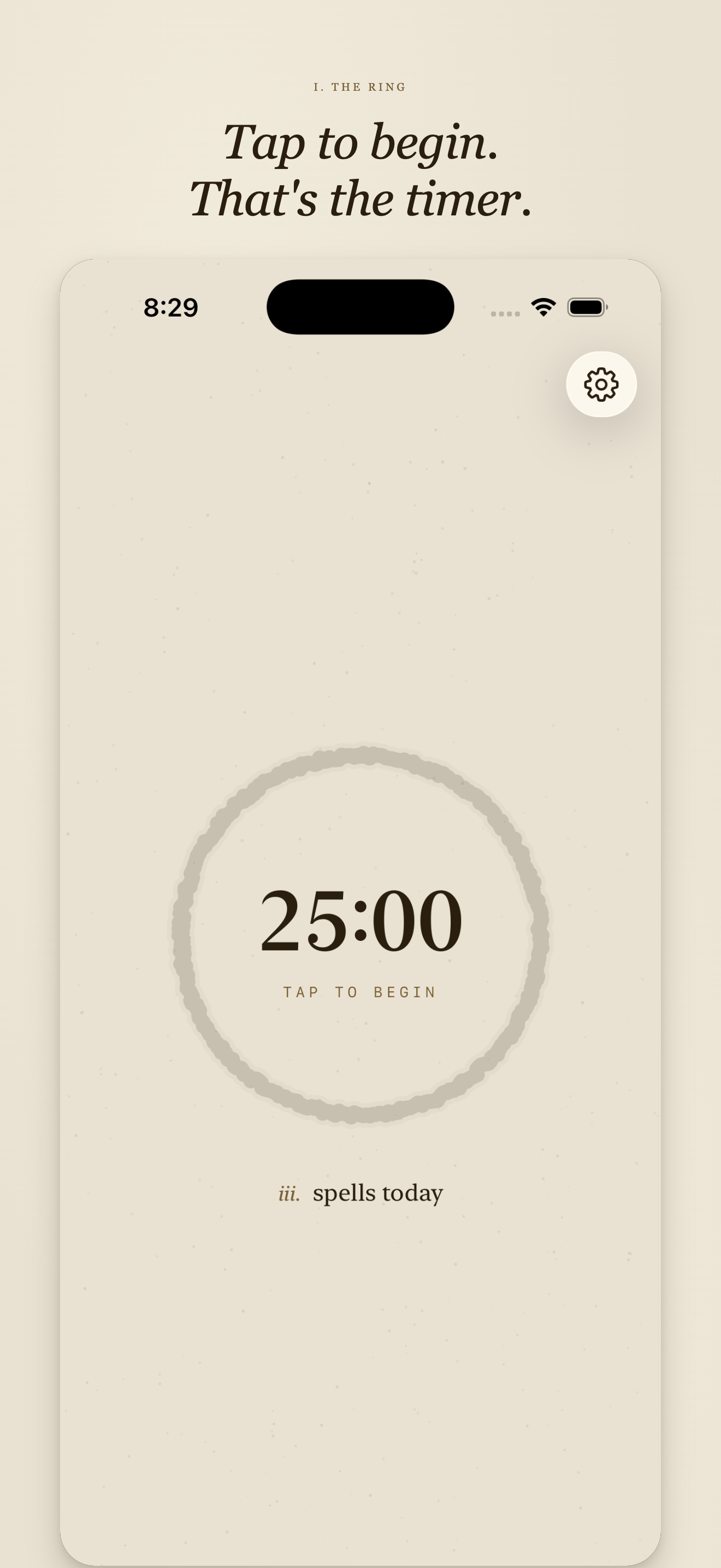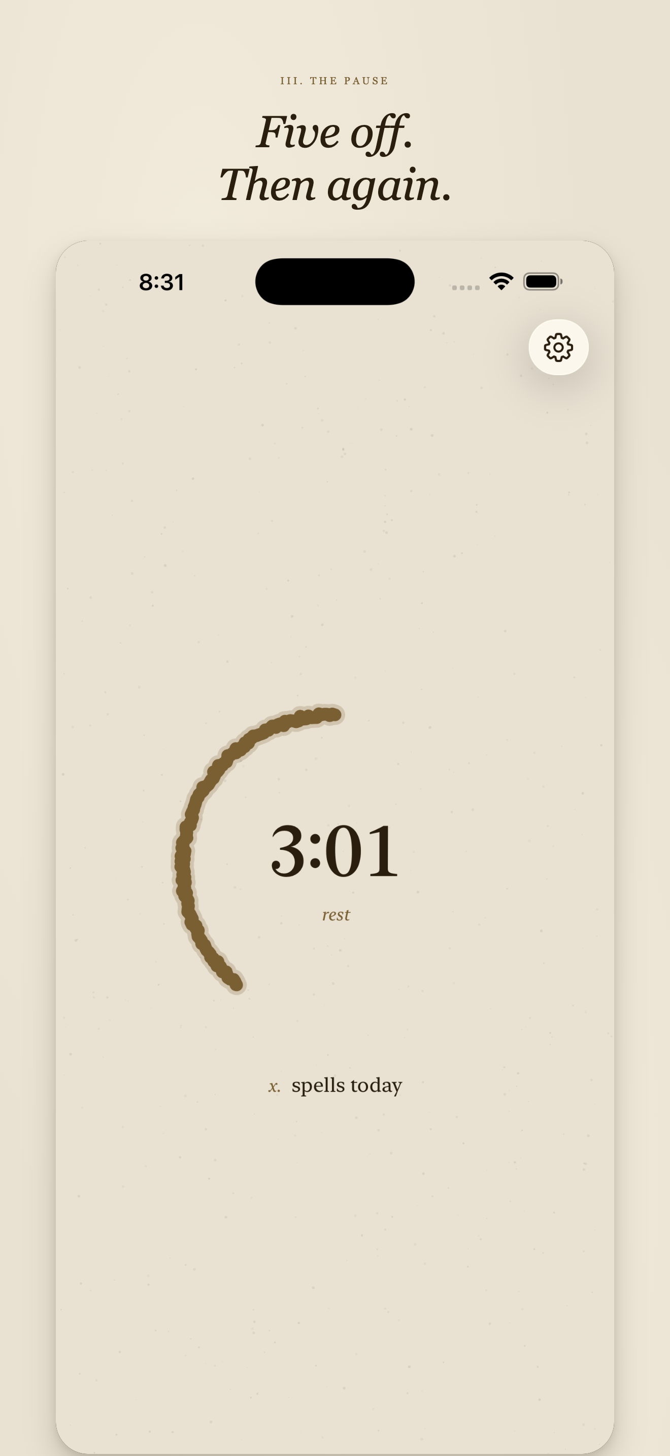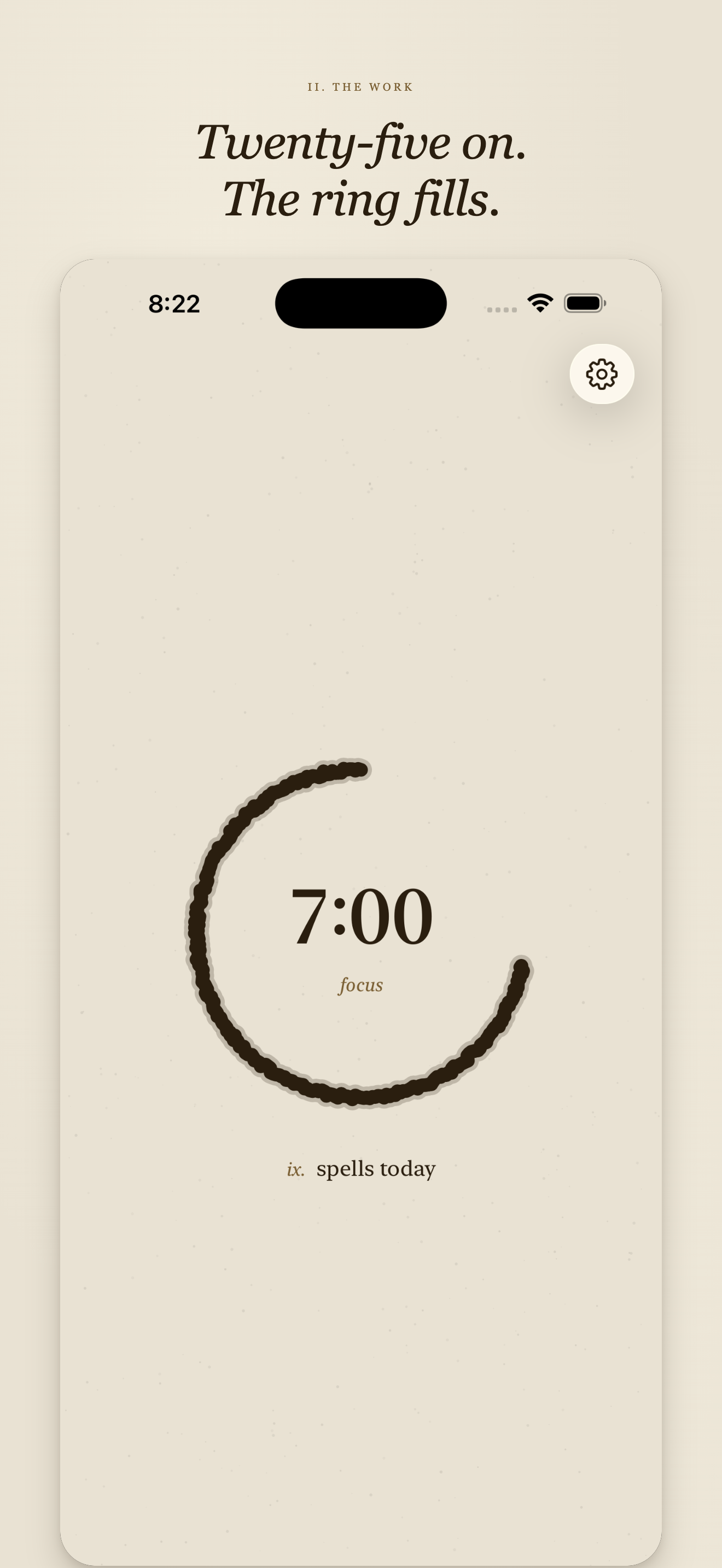 Most focus timers want to know what you're working on, then turn the work into a competition with yourself or a tree that dies if you check Twitter. A Spell of Work goes the other direction: one button, a ring that fills, a soft chime, and the break ring begins. That's the entire app.