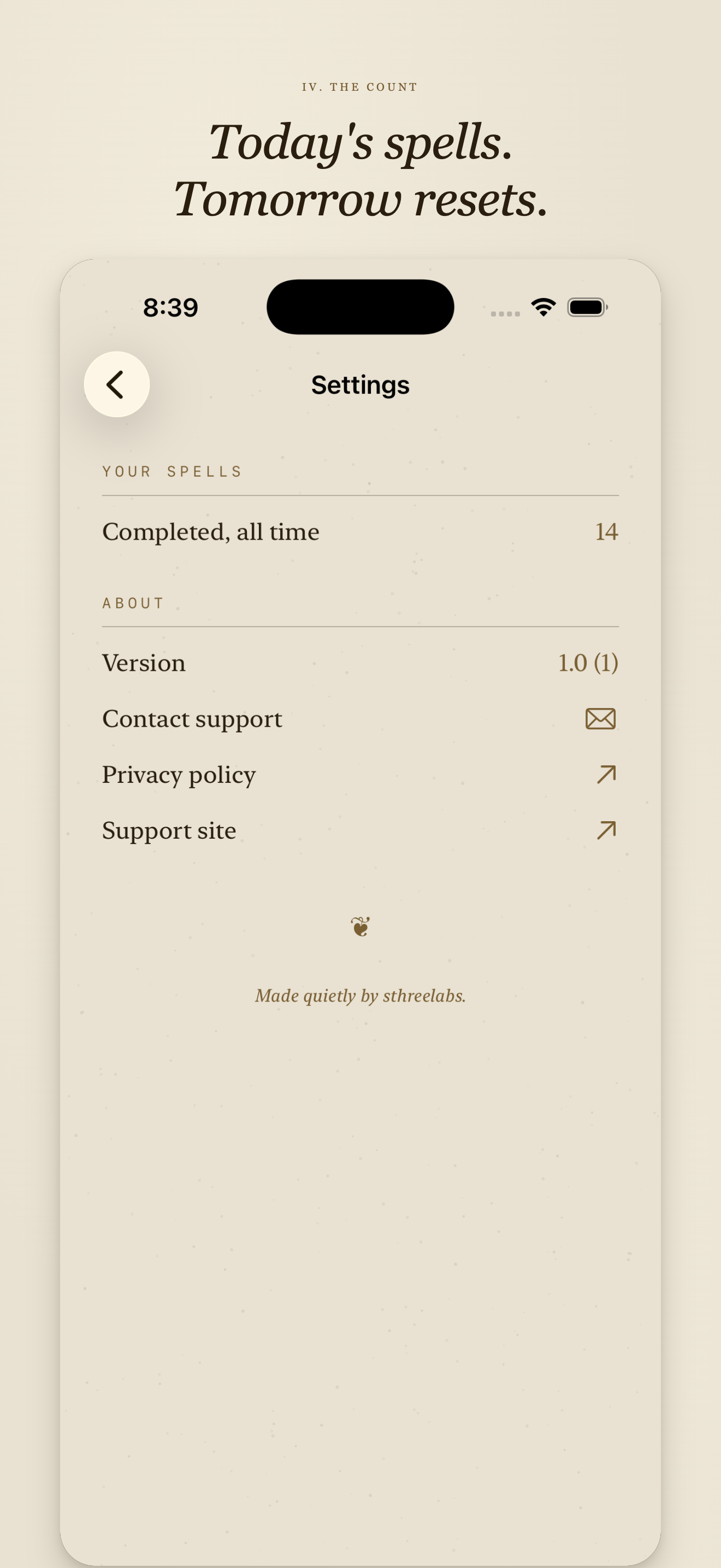 sthreelabs is a one-person studio making small, quiet iOS apps. Every app is paid once, has no notifications, collects no data, and is deliberately scoped to do one thing well. A Spell of Work is part of the paperback collection — alongside Tallies (habit counter), A Deep Breath (breathing paired with public-domain literature), and One Line in Time (one-line journal).