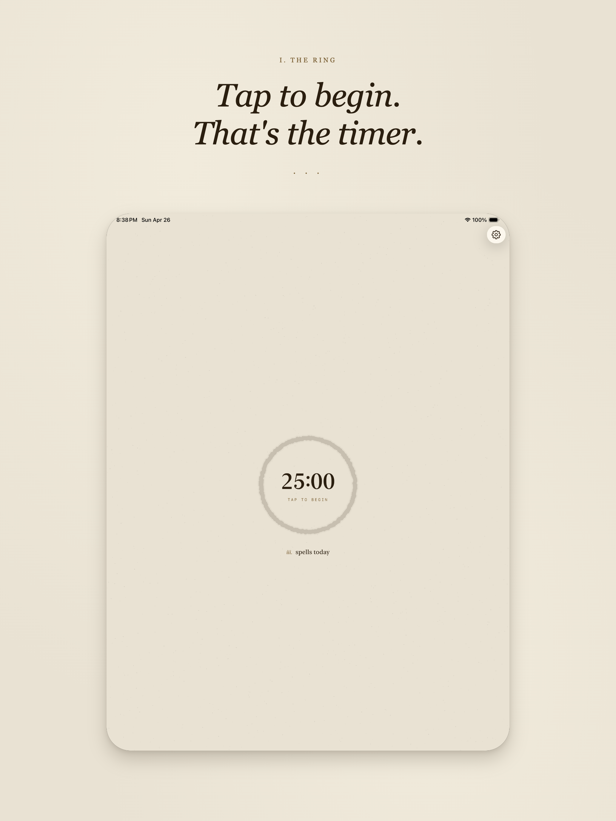 A Spell of Work is a focus timer for people tired of being gamified. Tap the ring; it fills over twenty-five minutes; soft chime; the break ring starts automatically. There are no tasks, no "what are you working on?" prompt, no graphs, no trees, no badges, no streak. Today's completed spell count is the entire statistic. Paid once at $2.99.