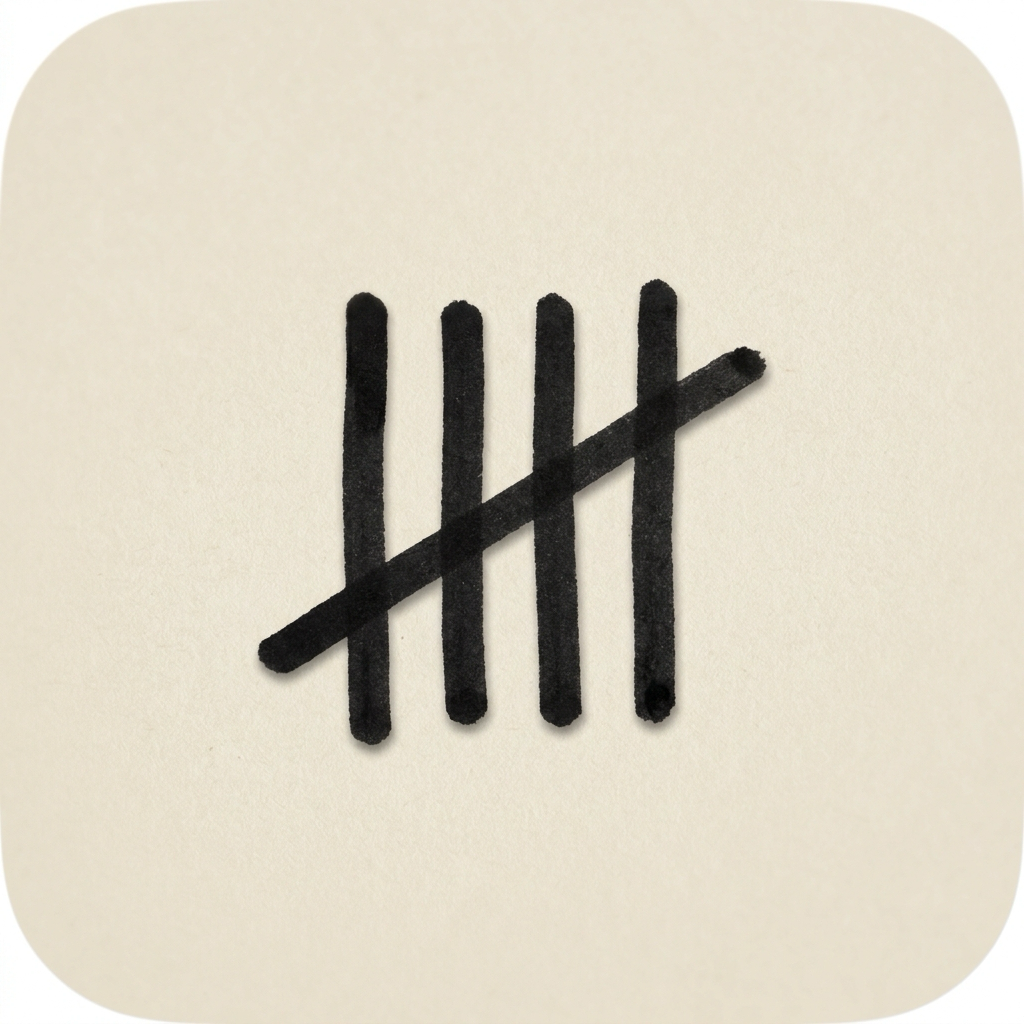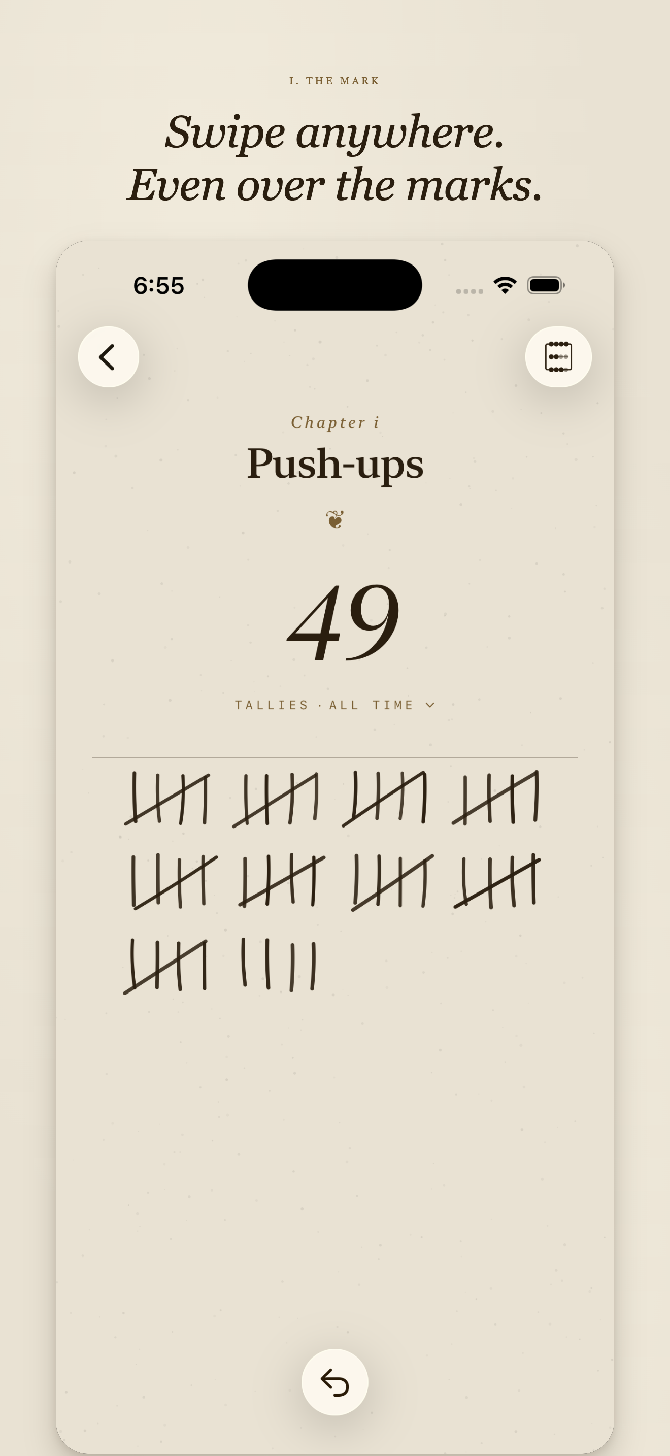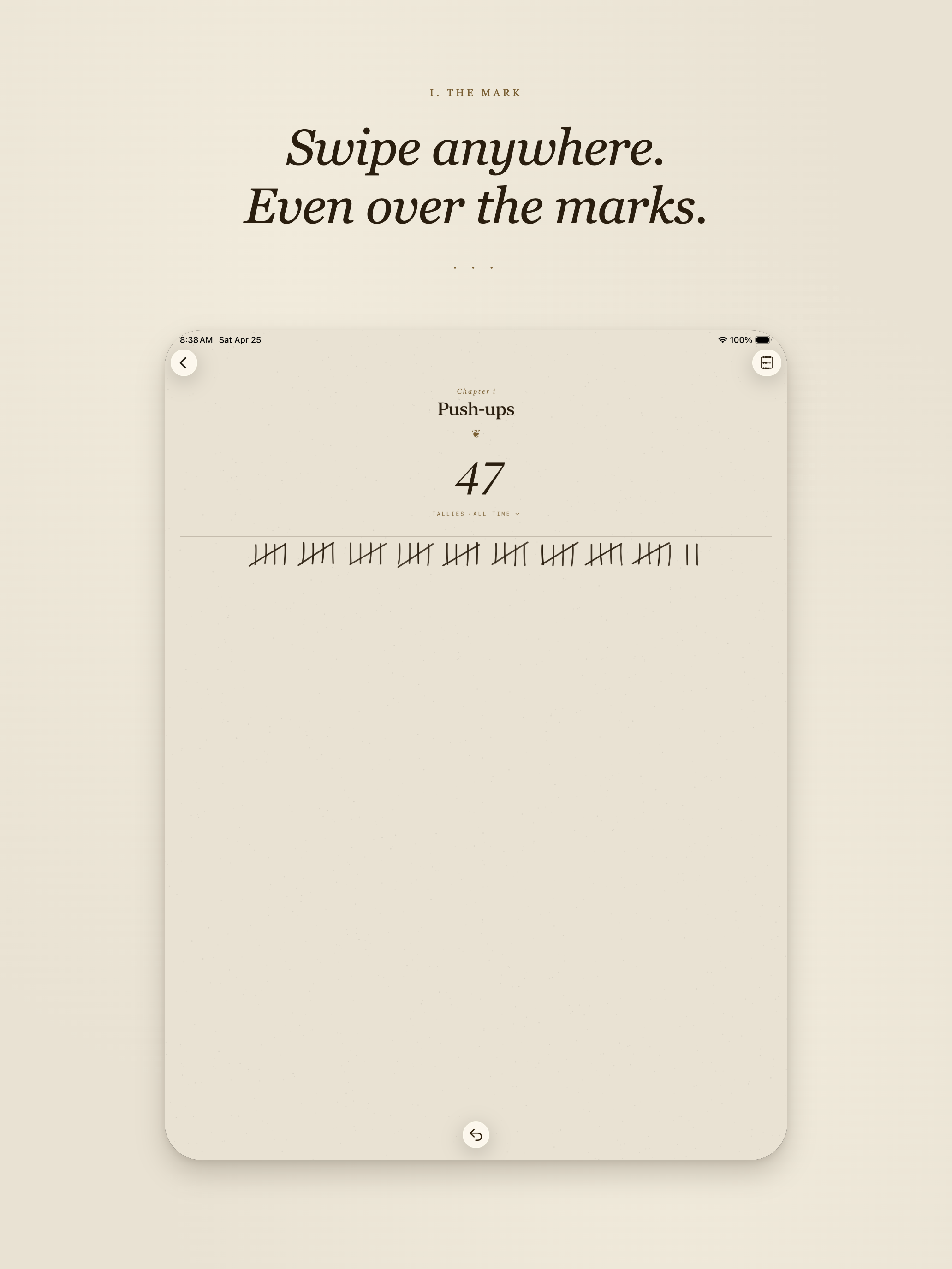 Tallies is a notebook-style counter for anything you'd tally — push-ups, knitting rows, prayer beads, birds at the feeder, sober days. You swipe anywhere on the page to draw a felt-marker mark, tap the home-screen widget, or ask Siri ("Tally push-ups in Tallies") and the count saves. There are no streaks, no notifications, no leaderboards, no subscription. Paid once at $2.99 and it stays out of your way.