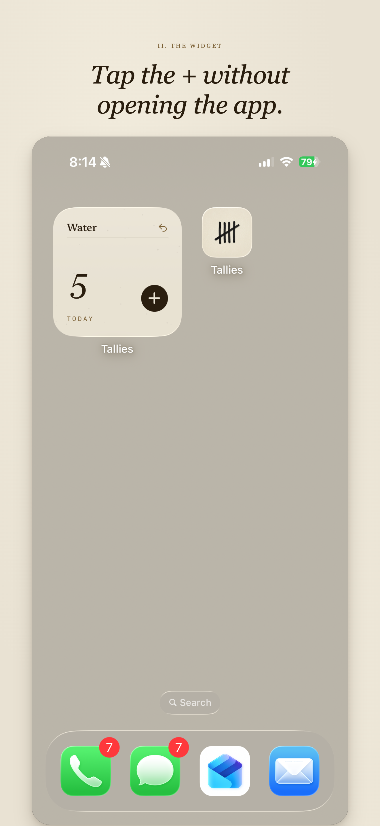 "Most habit trackers want you to use them more. Tallies does the opposite — gets out of the way. Open. Swipe. Close. Again tomorrow, or not. We don't keep score."
