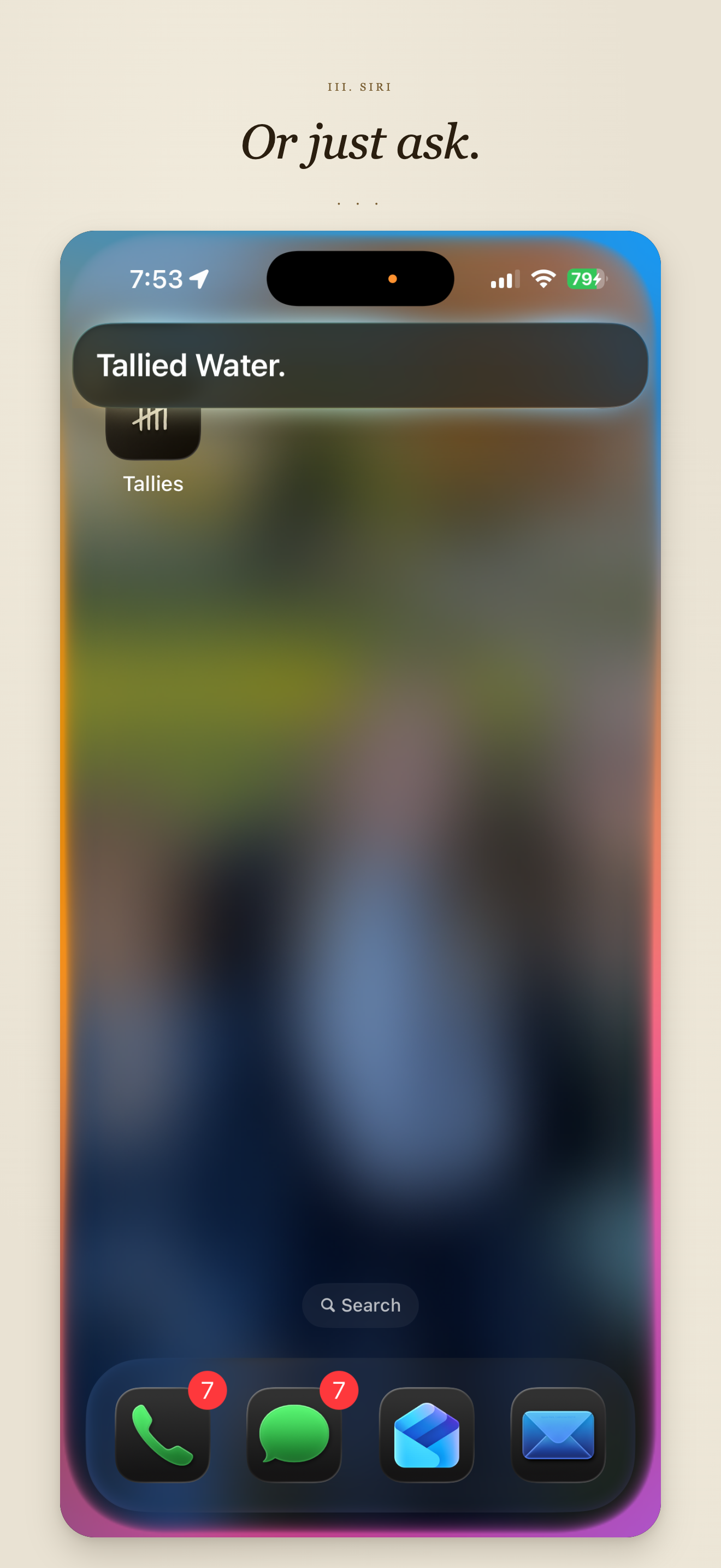 Siri / Shortcuts: "Hey Siri, tally push-ups in Tallies" — works from Spotlight, Shortcuts, and the Action Button