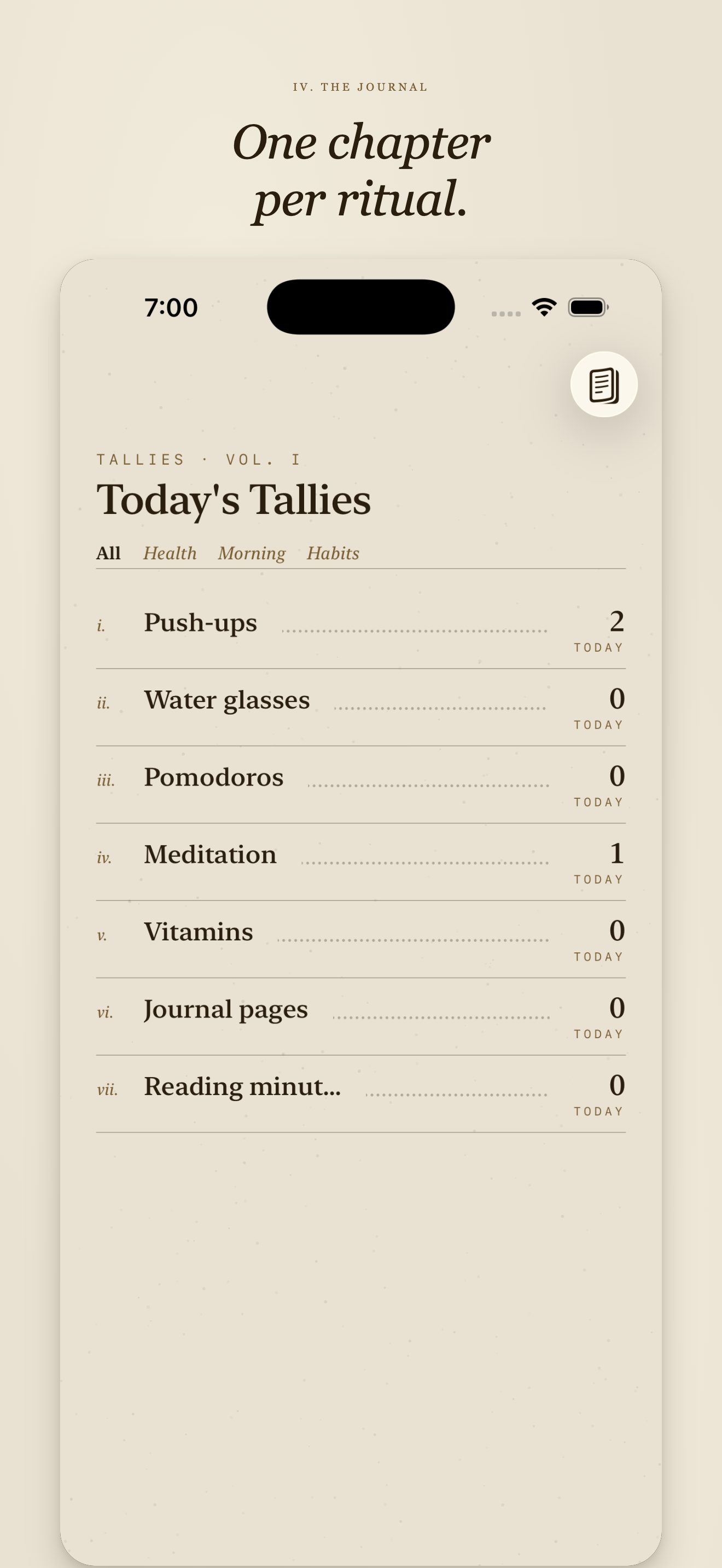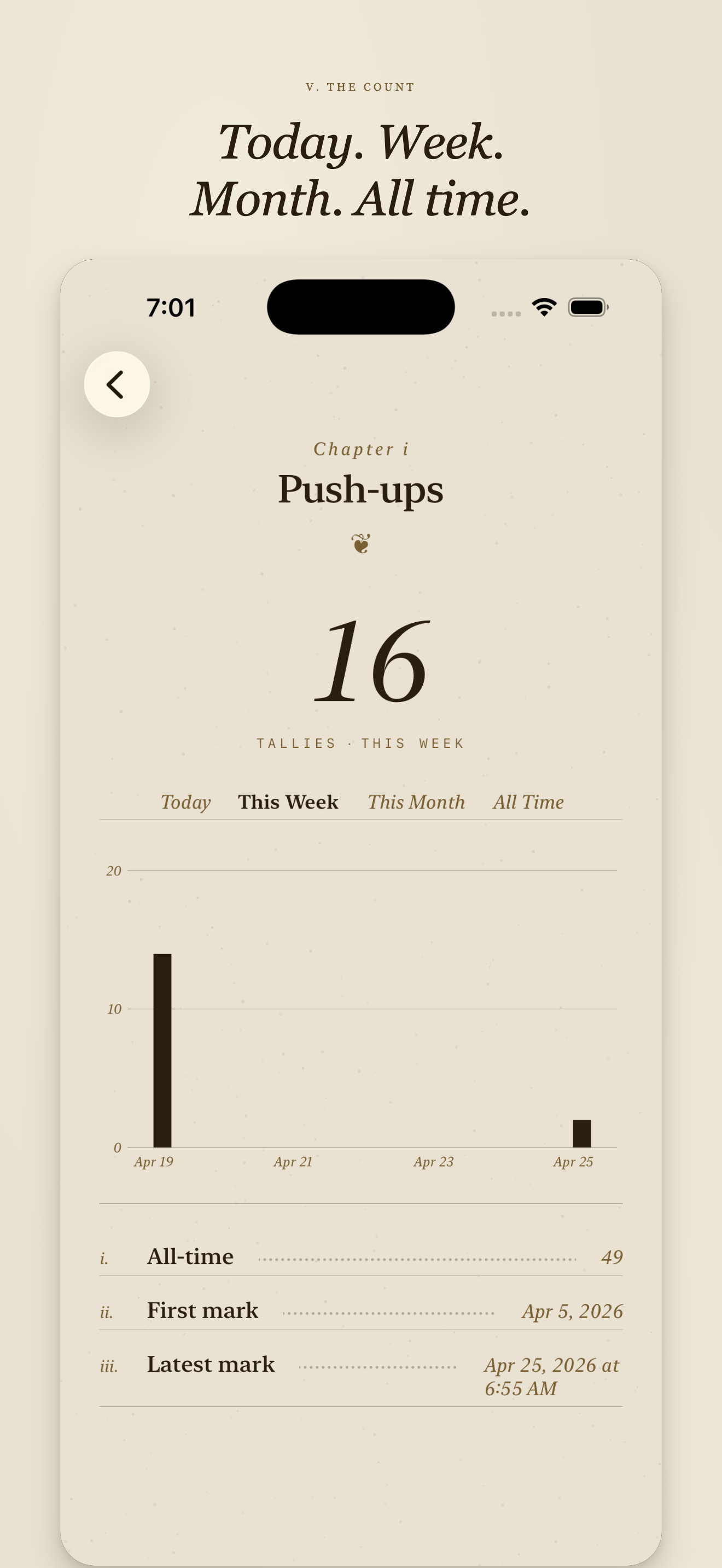 Each thing you're counting gets its own chapter — push-ups, hydration, knitting rows, rosaries, birds at the feeder, books finished, sober days. Every swipe draws a felt-marker mark on warm paperback paper. Five filters give you today, this week, this month, all time — plus a totals view.